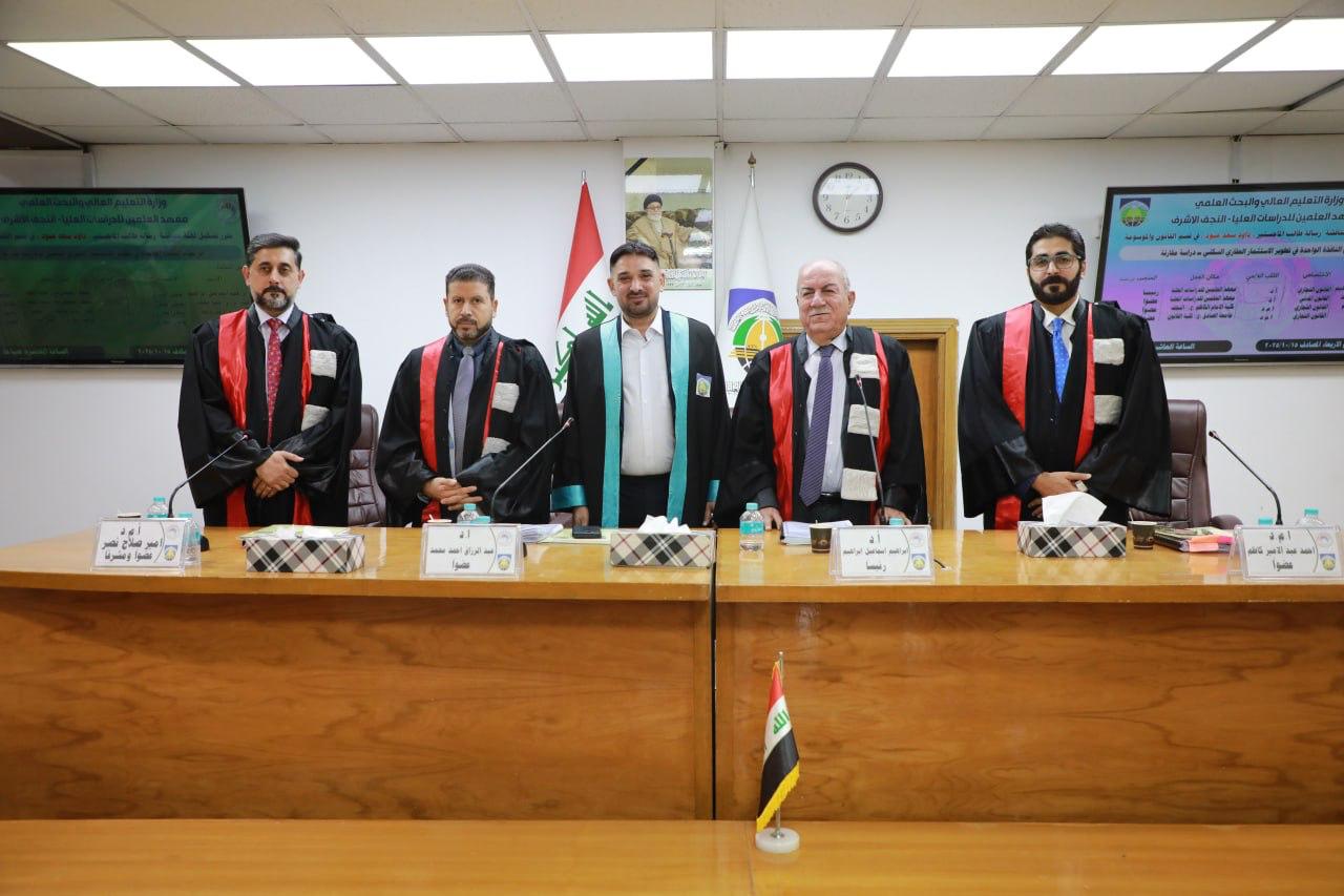 جرت في قسم القانون الخاص بمعهد العلمين للدراسات العليا، الاربعاء 15 تشرين الأول 2025، مناقشة رسالة الماجستير الموسومة "اثر نظام النافذة الواحدة في تطوير الاستثمار العقاري السكني - دراسة مقارنة" للطالب "داود سعد عبود" و ترأس لجنة المناقشة ا.د ابراهيم اسماعيل ابراهيم رئيس قسم القانون الخاص بمعهد العلمين، وضمت لجنة المناقشة ا.د عبد الرزاق احمد محمد من معهد العلمين، و ا.م.د احمد عبد الامير كاظم من كلية الامام الكاظم (ع) - النجف، و ا.م.د امير صلاح نصر من كلية القانون جامعة الصادق(ع) عضواً ومشرفاً، وبعد مناقشة مستفيضة تم إجازة الرسالة.