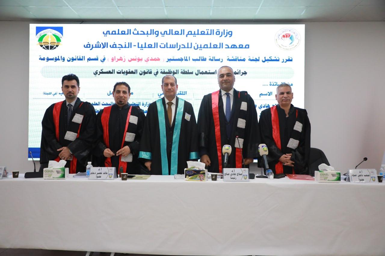 جرت في قسم القانون بمعهد العلمين للدراسات العليا، السبت ٢٦ آب 2025، مناقشة رسالة الماجستير الموسومة "جرائم إساءة استعمال سلطة الوظيفة في قانون العقوبات العسكري"للطالب "حمدي يونس زهراو" و ترأس لجنة المناقشة التي جرت على قاعة ملتقى بحر العلوم في بغداد، ا.د صلاح هادي صالح من وزارة التعليم العالي والبحث العلمي، وضمت لجنة المناقشة ا.د خالد خضير دحام المعاون الاداري لعمادة معهد العلمين، و ا.د صعب ناجي عبود رئيس قسم القانون بمعهد العلمين، و ا.د محمد حميد عبد من كلية القانون الجامعة العراقية عضواً ومشرفاً، وبعد مناقشة مستفيضة تم إجازة الرسالة.