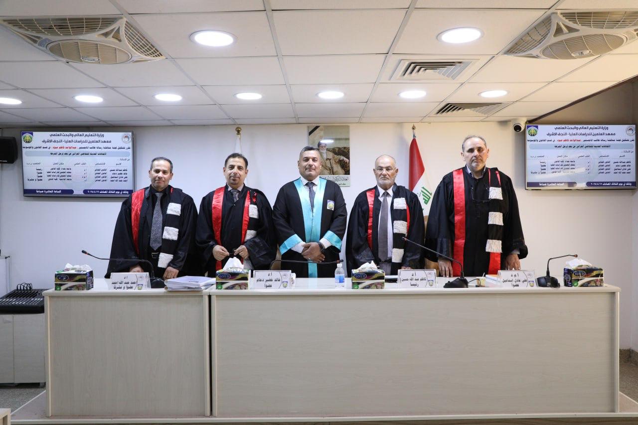 جرت في قسم القانون بمعهد العلمين للدراسات العليا، السبت ١٩ آب 2025، مناقشة رسالة الماجستير الموسومة "الاتجاهات الحديثة للتقاضي الجزائي عن بعد لرجل الشرطة" للطالب "عبد الواحد كاظم عبود" و ترأس لجنة المناقشة ا.د كاظم عبد الله حسين من كلية القانون جامعة بغداد، وضمت لجنة المناقشة ا.د خالد خضير دحام المعاون الاداري لعمادة معهد العلمين، و ا.م.د علي عادل اسماعيل المعاون العلمي لعمادة معهد العلمين، و ا.د احمد حمد الله احمد من كلية القانون جامعة القادسية عضواً ومشرفاً، وبعد مناقشة مستفيضة تم إجازة الرسالة.