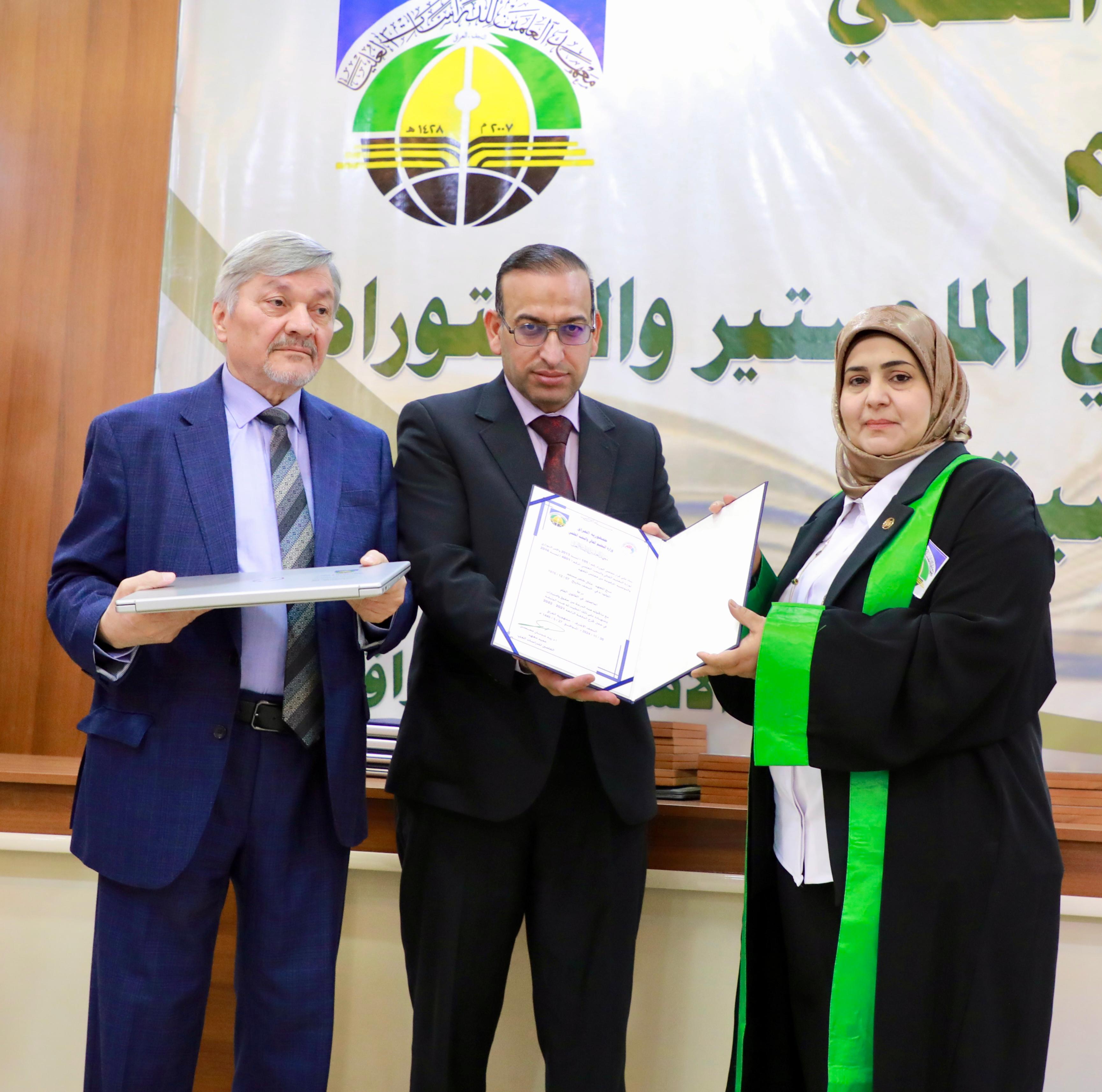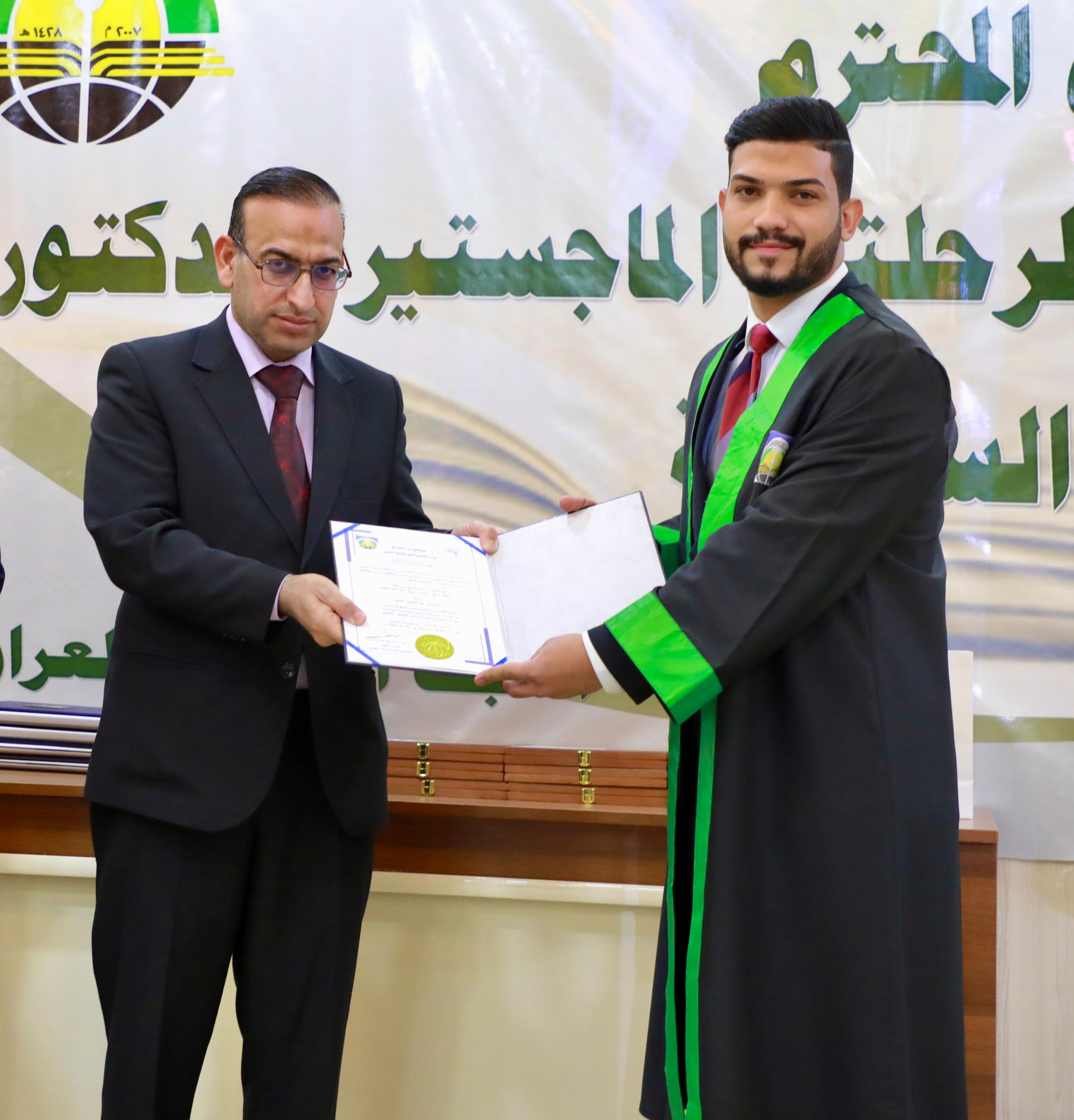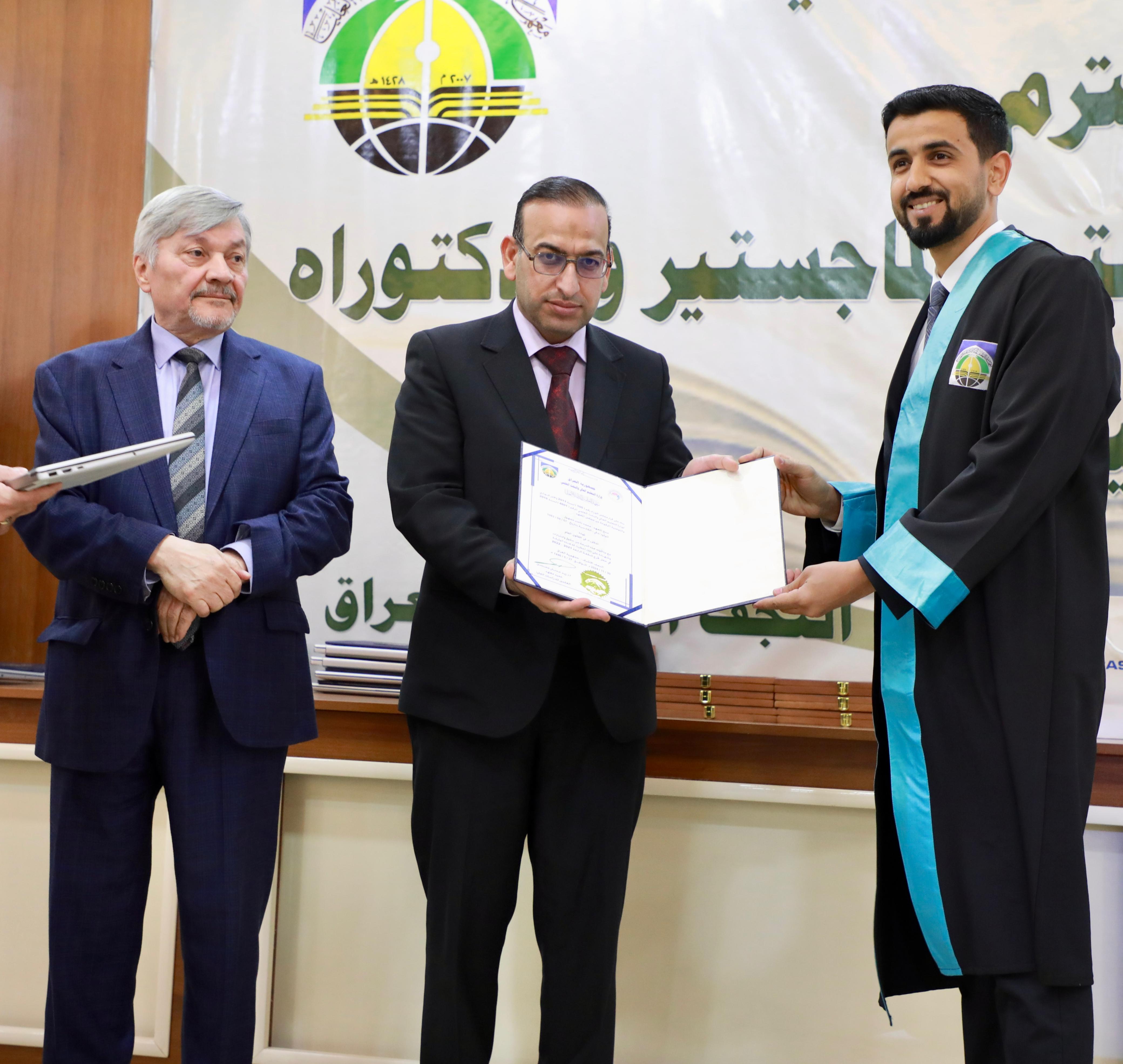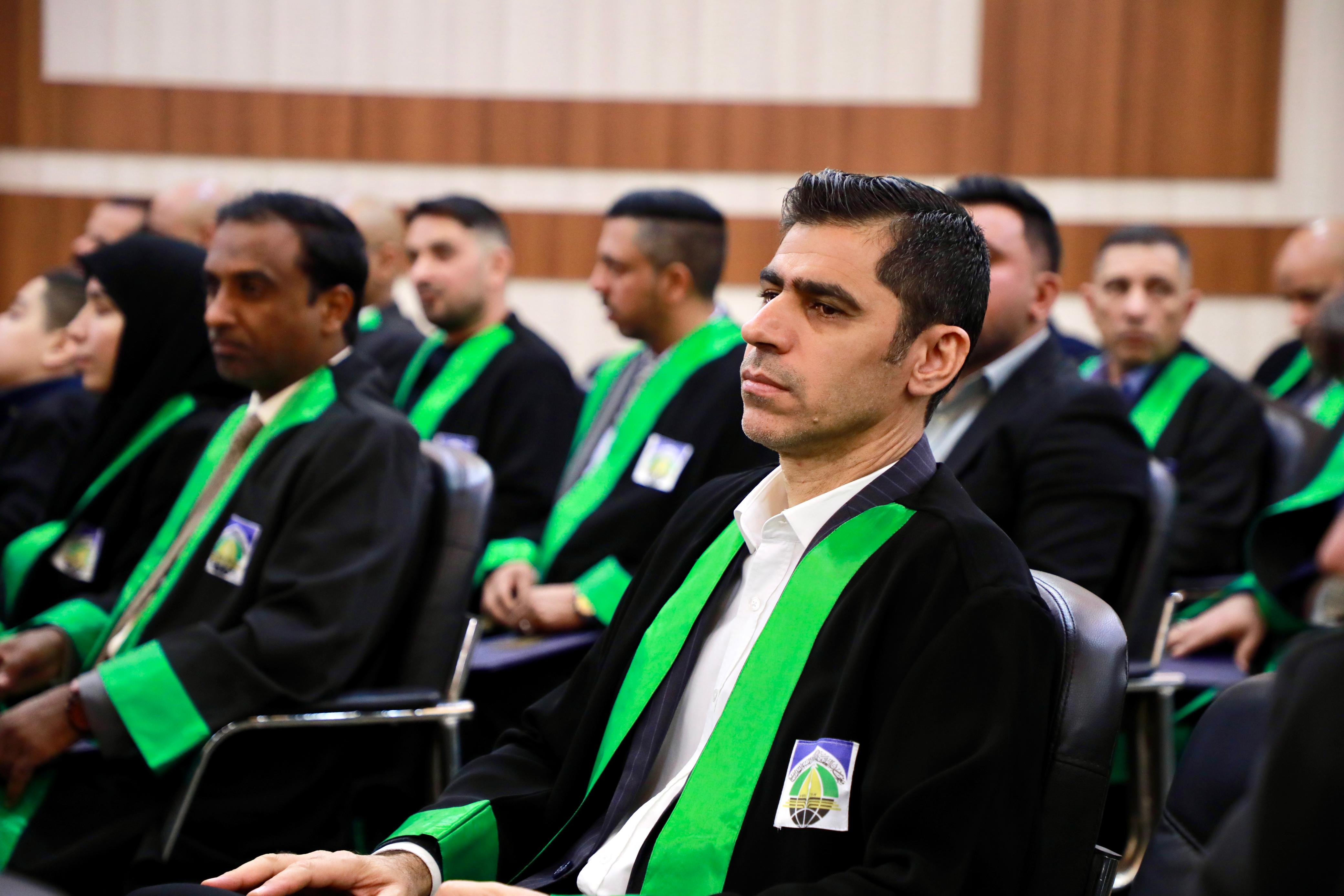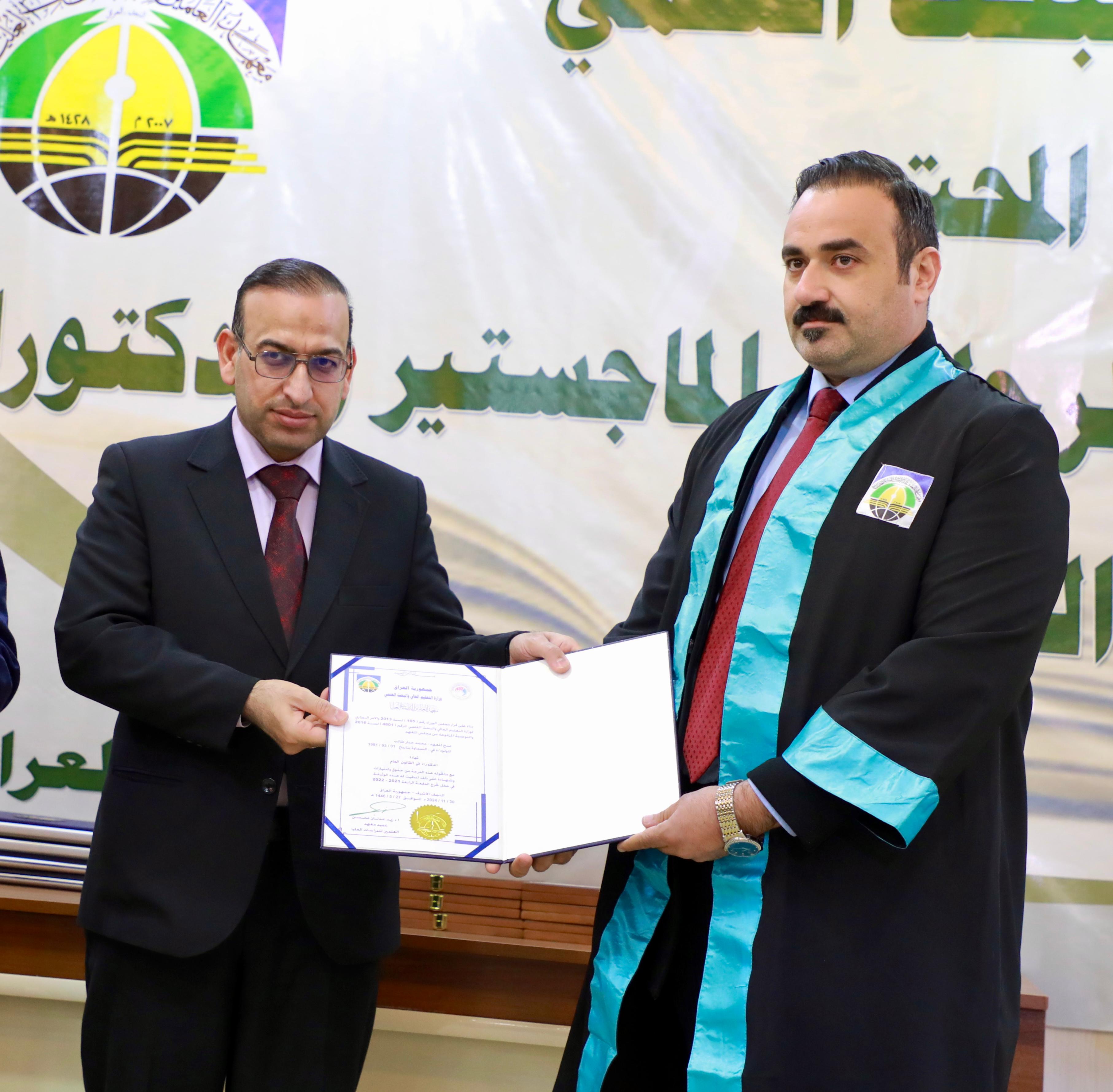 Following the recitation of the graduation oath, outstanding doctoral and master’s students in Public Law, Private Law, and Political Science were honored, along with several faculty members, the “Thirst of Iraq” team, and staff members of the Bahr Al-Uloom Charitable Foundation. Professor Dr. Ammar Al-Salami, President of the Islamic University, presented gifts to the top doctoral graduates.
