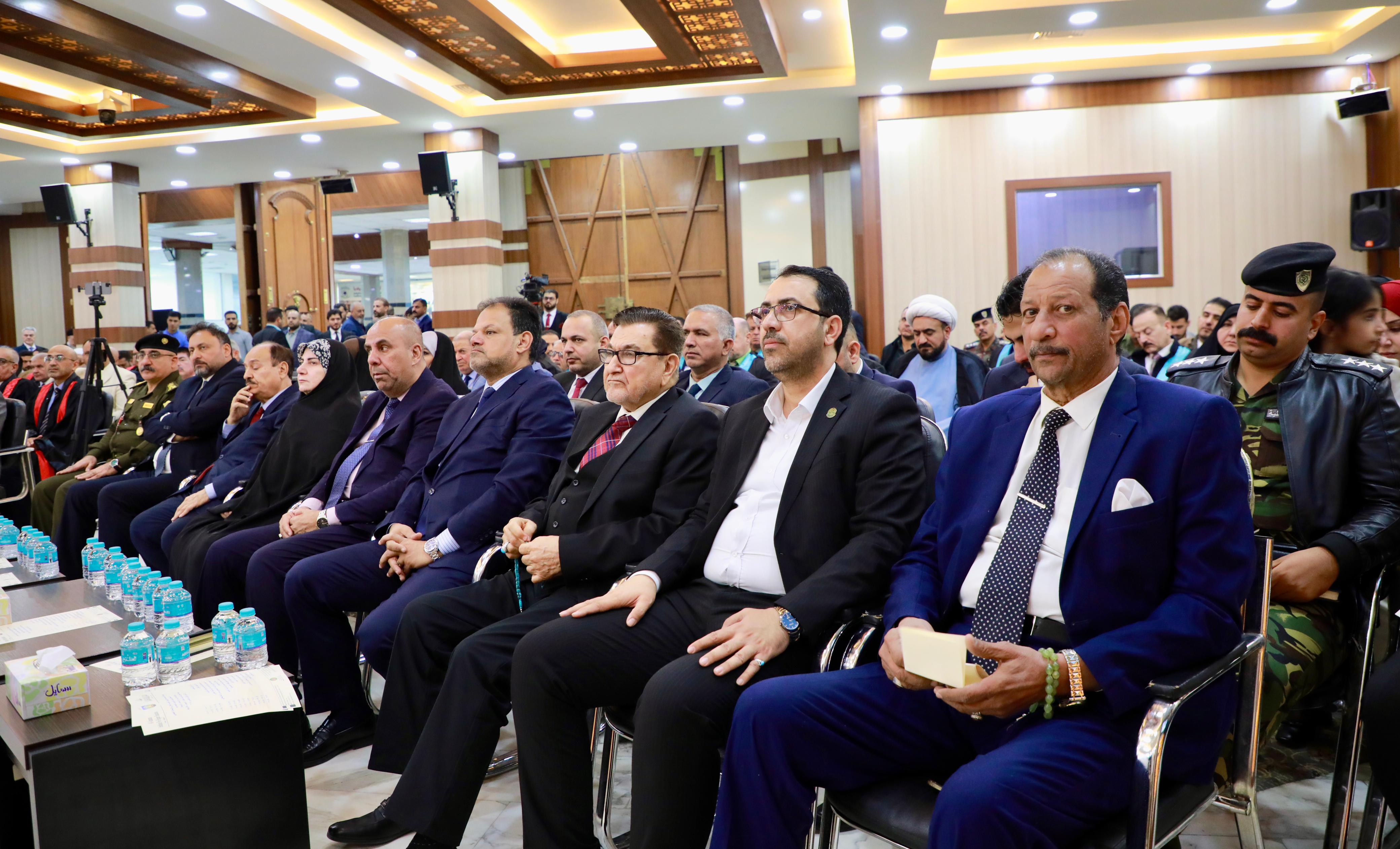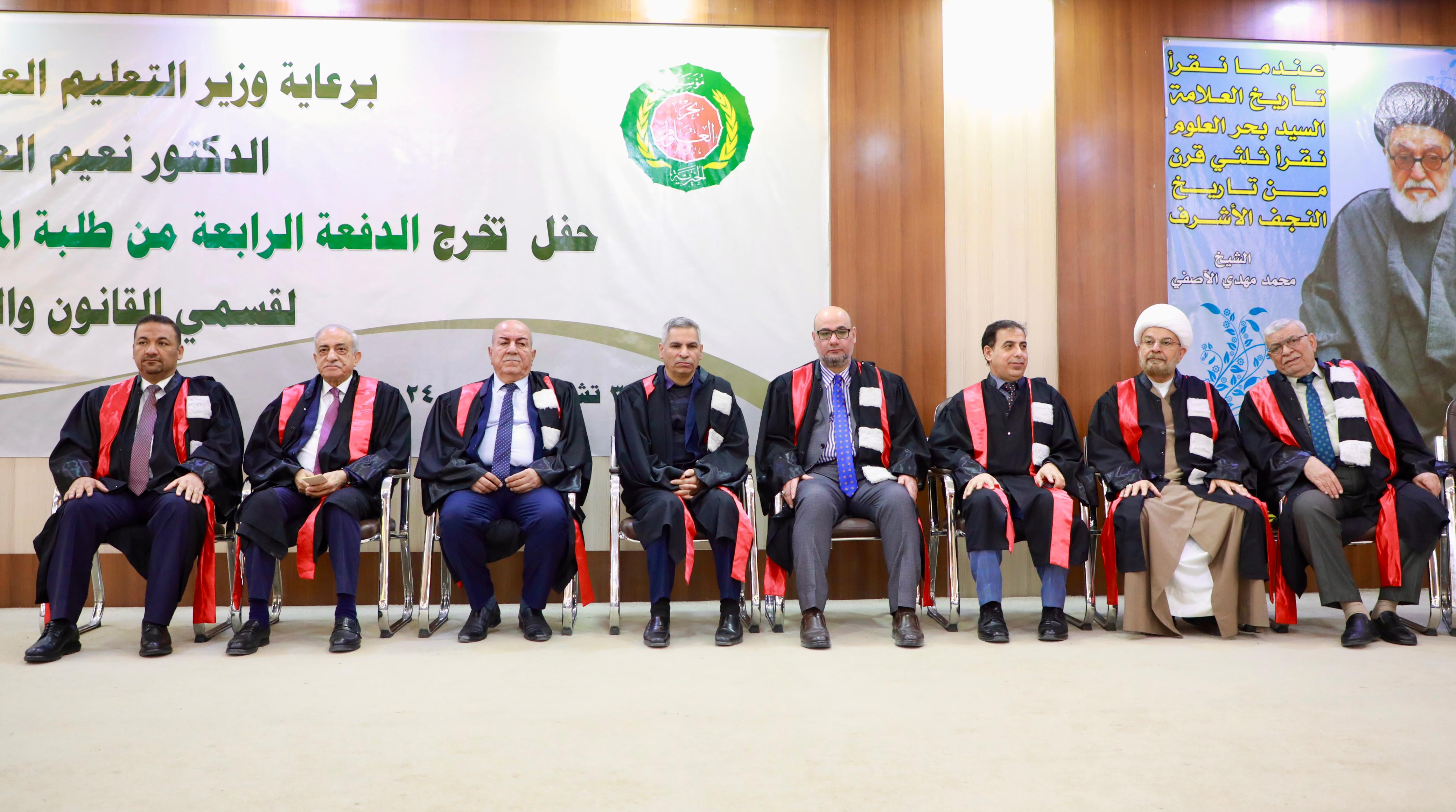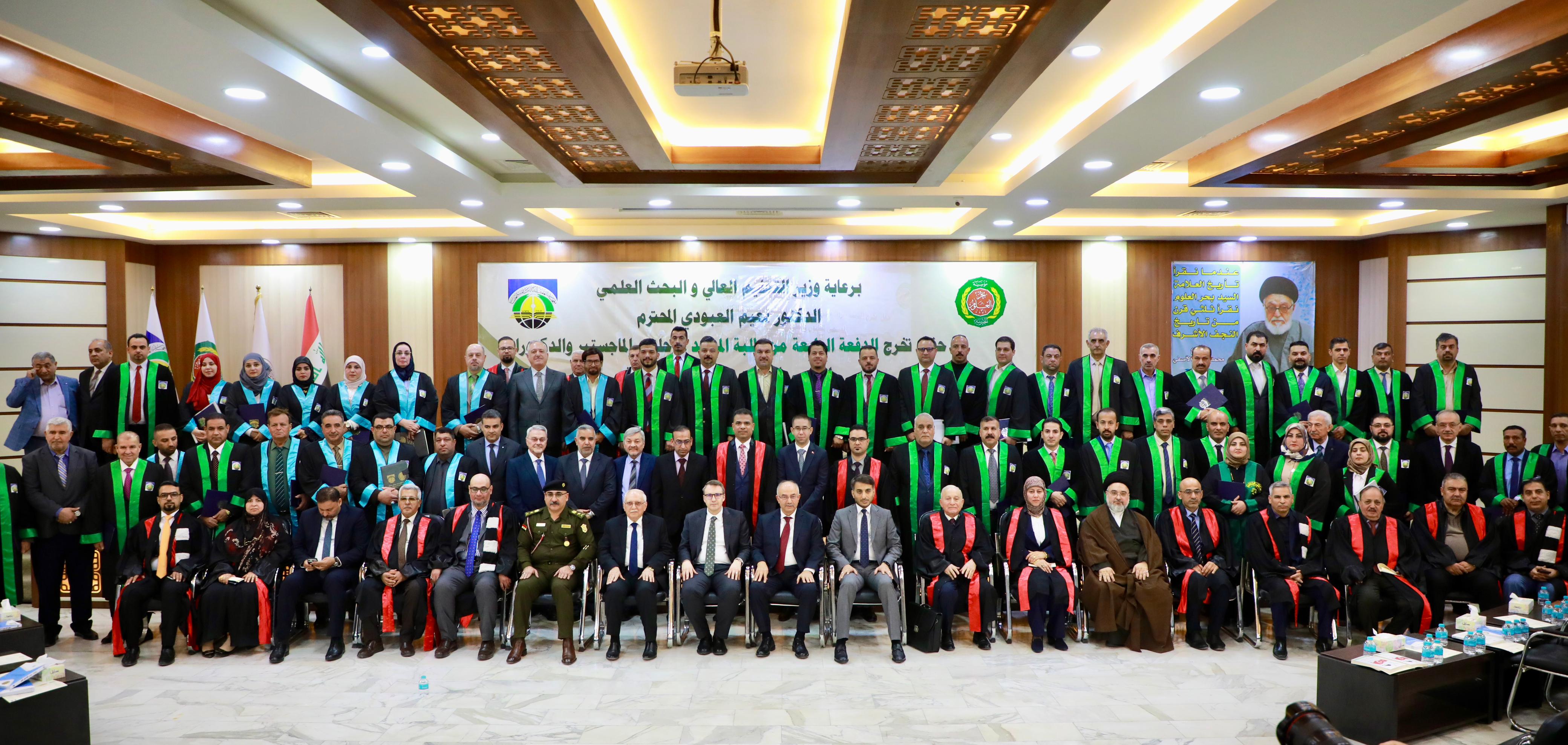 In conclusion, Dr. Ibrahim Bahr Al-Uloom honored Professor Dr. Alaa Al-Moula, President of the University of Kufa and representative of the Minister of Higher Education and Scientific Research, Ambassador Anıl Bora İnan, and Turkish dignitary Mr. Ahmed Malkan. The graduates then posed for a commemorative photo with the founding board, faculty members, and distinguished guests.