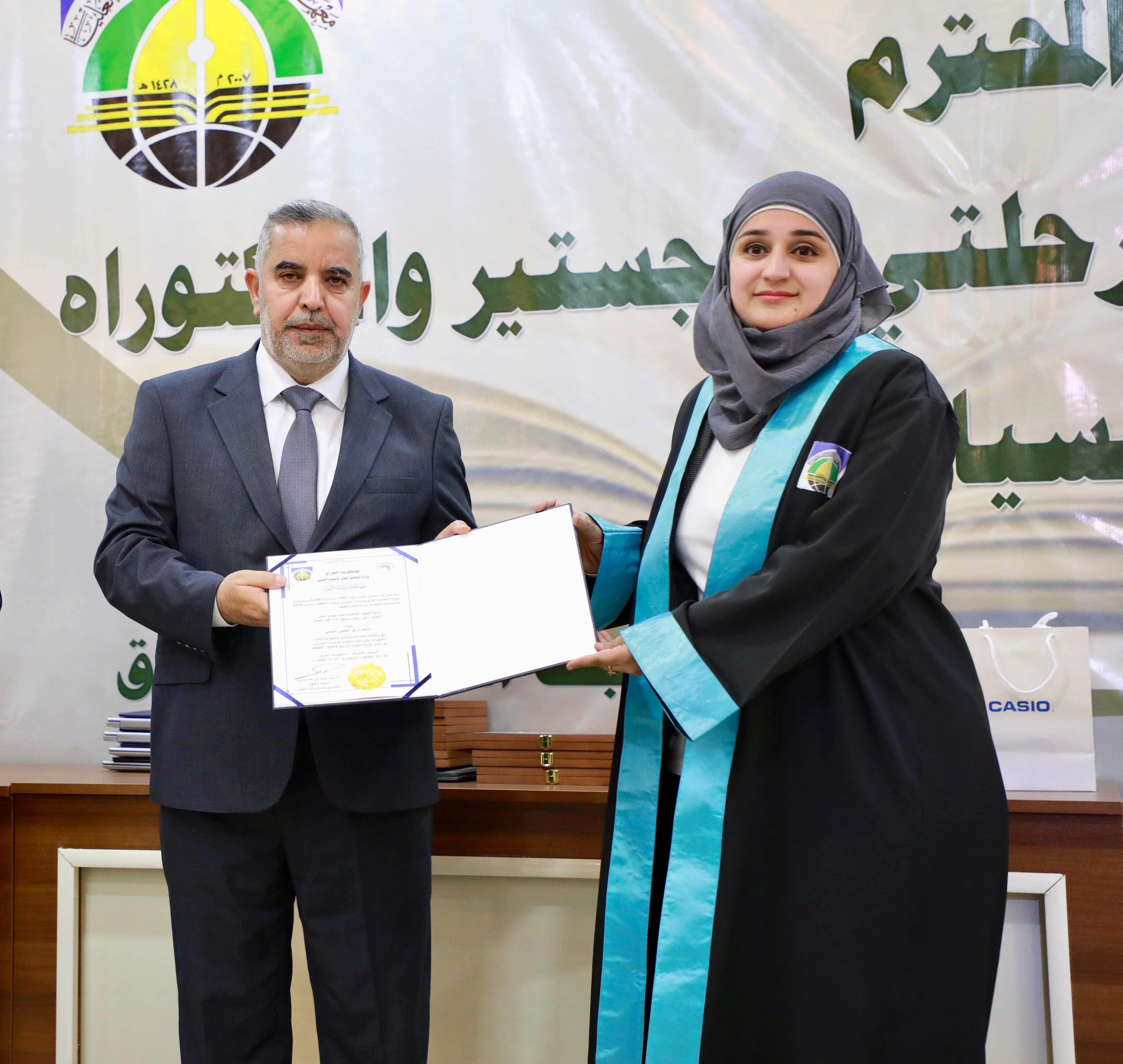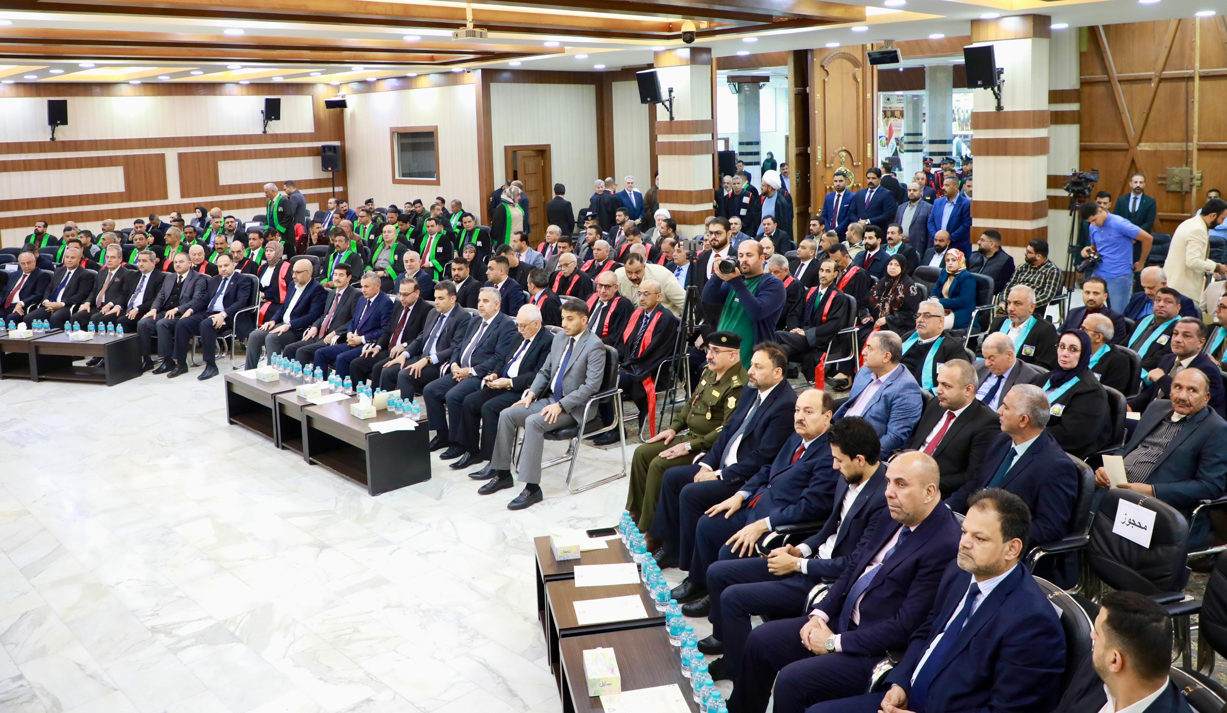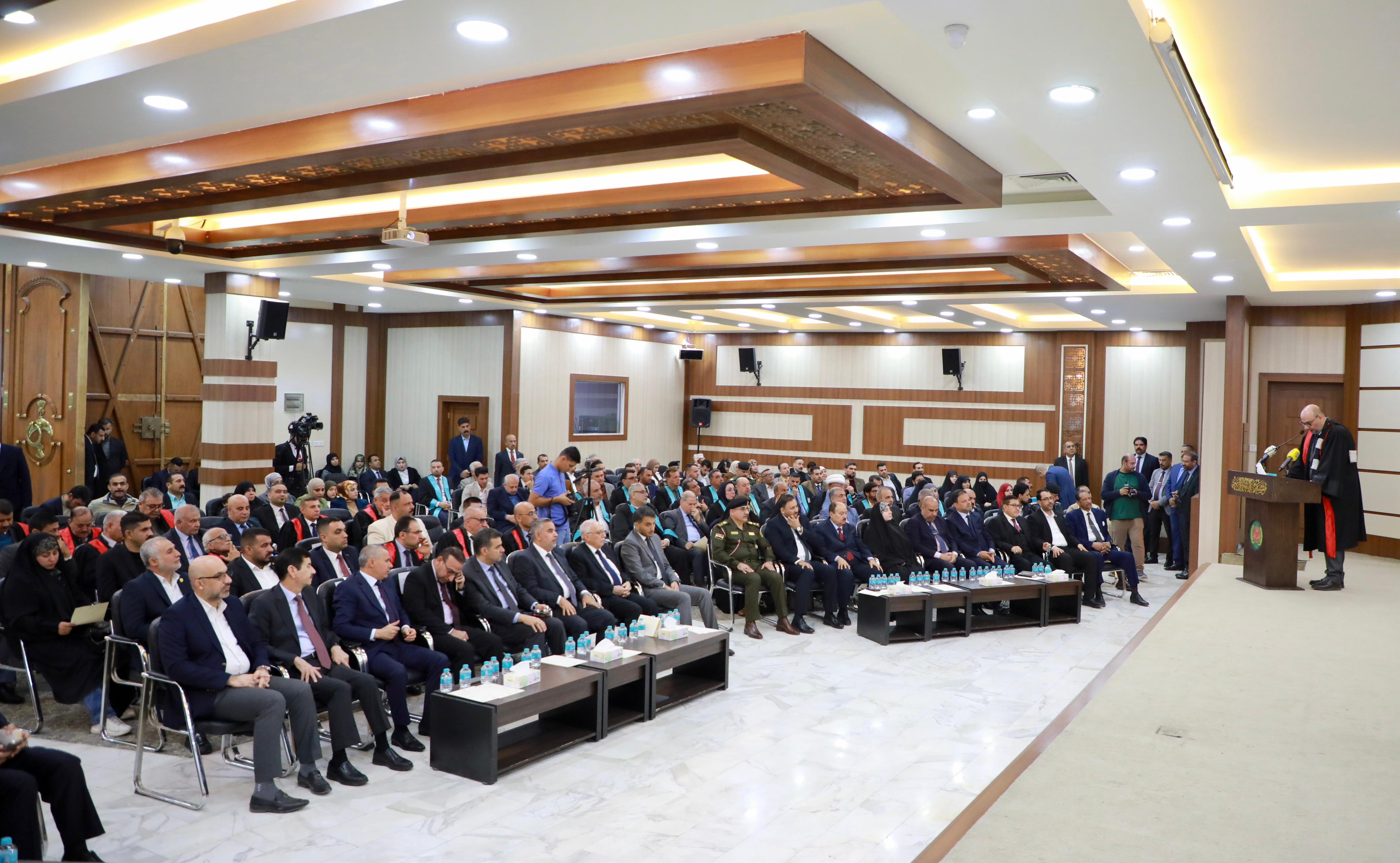In conclusion, Dr. Ibrahim Bahr Al-Uloom honored Professor Dr. Alaa Al-Moula, President of the University of Kufa and representative of the Minister of Higher Education and Scientific Research, Ambassador Anıl Bora İnan, and Turkish dignitary Mr. Ahmed Malkan. The graduates then posed for a commemorative photo with the founding board, faculty members, and distinguished guests.
