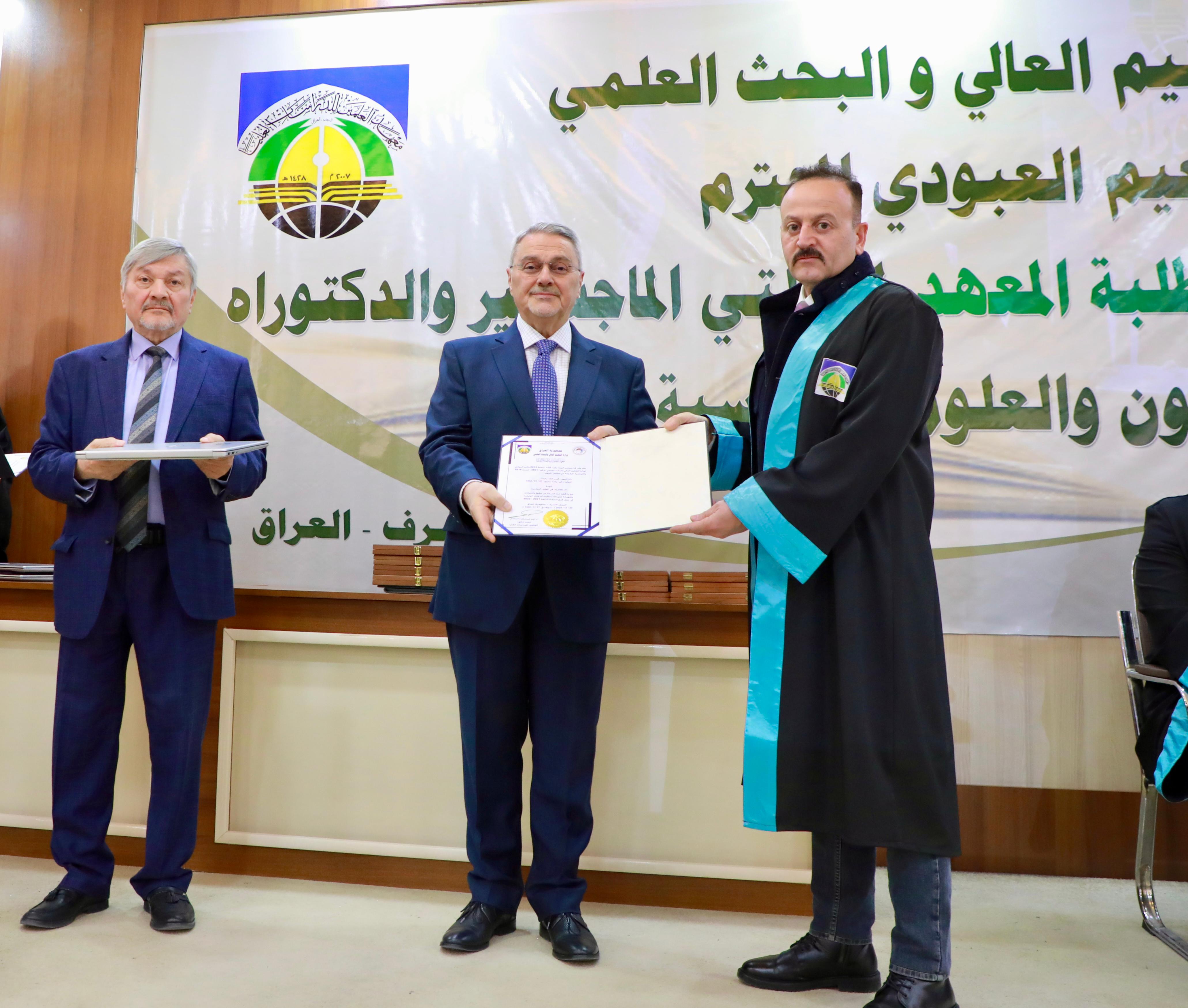 Professor Dr. Alaa Al-Moula, President of the University of Kufa and representative of the Minister of Higher Education and Scientific Research, praised Al-Alamain Institute for Graduate Studies, highlighting its academic rigor and esteemed standing among Iraq’s reputable scientific institutions. The Minister of Agriculture, Dr. Abbas Jabr Al-Maliki, delivered a speech on behalf of the “Al-Alamain Scientific Forum,” which brings together all graduates of the Institute holding master’s and doctoral degrees. Established on April 25, 2024, the Forum was commended for fostering a scholarly environment, supporting faculty members, and providing care and facilities for students and researchers alike.