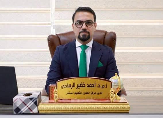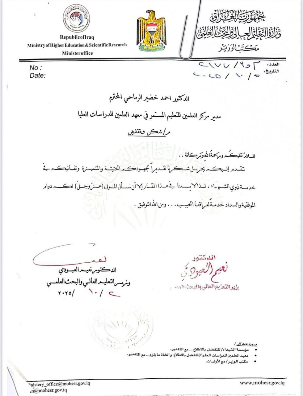 His Excellency the Minister of Higher Education and Scientific Research, Dr. Naeem Al-Aboudi, thanked the efforts of Assistant Professor Dr. Ahmed Khadir Al-Ramahi, Director of the Al-Alamein Center for Continuing Education at the Al-Alamein Institute for Graduate Studies in Najaf, for supporting the families of martyrs and developing their research and skill capabilities through the center's courses, according to a letter from the Minister's office dated October 5, 2025.