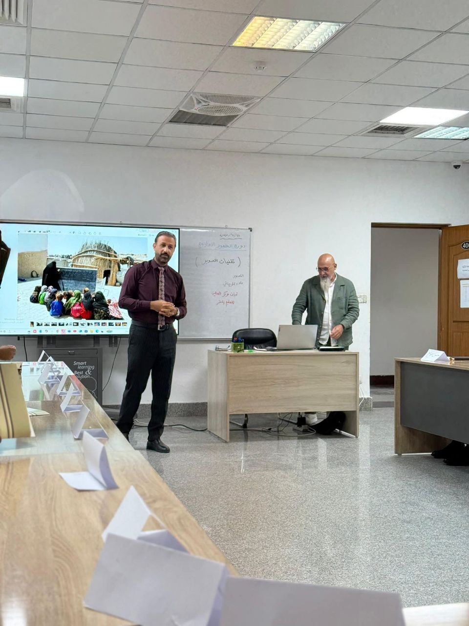 The Alamein Center for Continuing Education at the Alamein Institute for Graduate Studies in Najaf hosted international photographer Alaa Al-Marjani as part of the training program for the Media Appearance Course on its second day, Sunday, October 12, 2025.