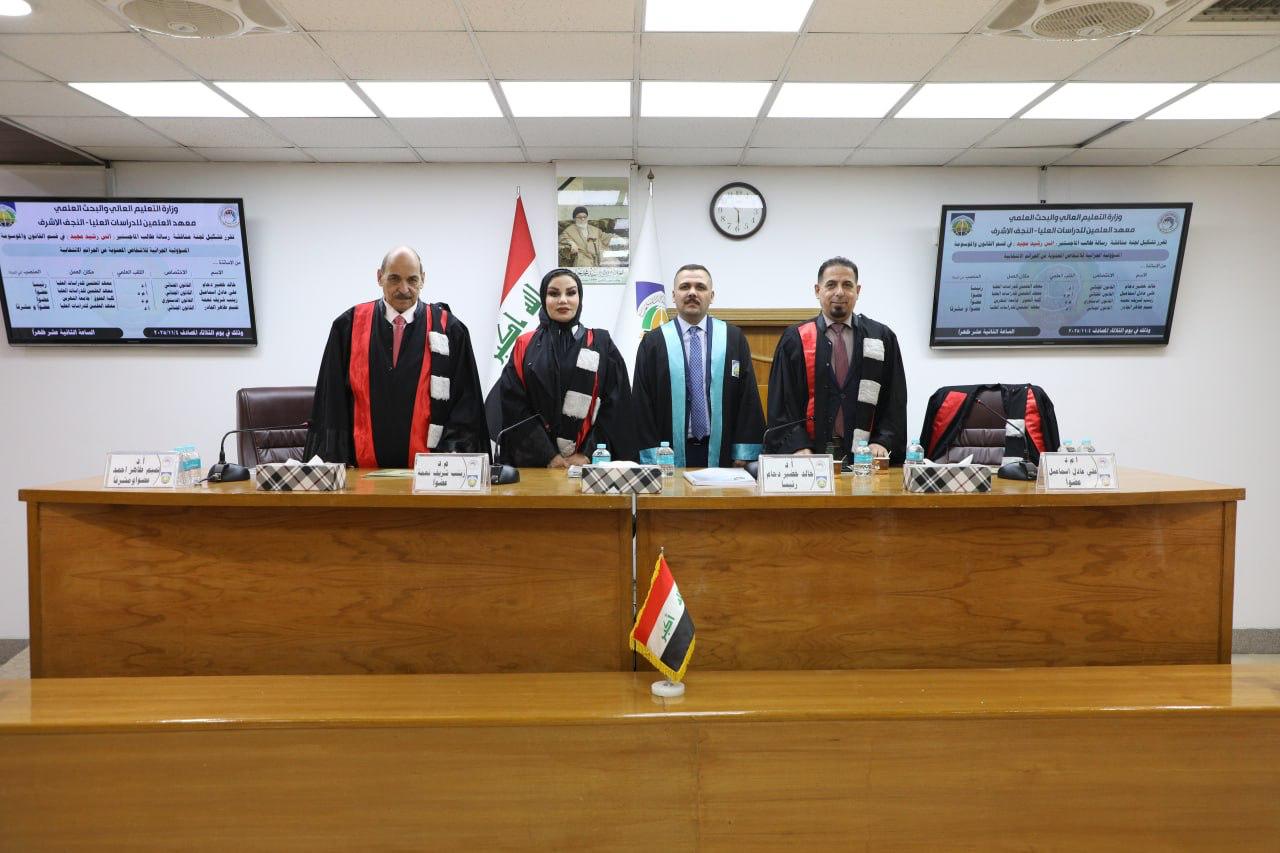 On Tuesday, November 4, 2025, in the Law Department of Al-Alamein Institute for Graduate Studies, the diploma research entitled “Criminal Liability of Legal Entities for Electoral Crimes” by student “Anas Rashid Majeed” was discussed. The discussion committee was chaired by Professor Dr. Khalid Khudair Daham, the Administrative Assistant to the Dean of Al-Alamein Institute, and included Assistant Professor Dr. Ali Adel Ismail, the Scientific Assistant to the Dean of Al-Alamein Institute, Dr. Zainab Sharif Naama from the College of Law, Al-Nahrain University, and Professor Dr. Tamim Taher Ahmed from Al-Alamein Institute as a member and supervisor. After an extensive discussion, the research was approved.