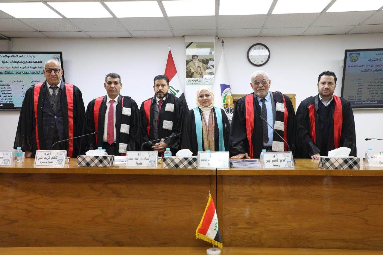 جرت في قسم القانون الخاص بمعهد العلمين للدراسات العليا، الثلاثاء 13 كانون الثاني 2026، مناقشة اطروحة الدكتوراه الموسومة "الضمانات القانونية لحماية حقوق المستهلك بين القانونين العراقي والانكليزي" للطالبة "سارة محمود ابراهيم" و ترأس لجنة المناقشة ا.د عزيز كاظم جبر من معهد العلمين، وضمت لجنة المناقشة ا.د حسن محمد كاظم و ا.د عبد الرزاق احمد محمد من معهد العلمين، وا.د احمد سمير محمد من كلية القانون والعلوم السياسية جامعة كركوك، وا.م.د محمد عامر شنجار من كلية القانون جامعة البيان، وا.د ضمير حسين ناصر من كلية القانون جامعة بابل و ا.م.د كاظم كريم علي من الدائرة القانونية بمجلس الوزراء عضوين ومشرفين، وبعد مناقشة مستفيضة تم إجازة الاطروحة.