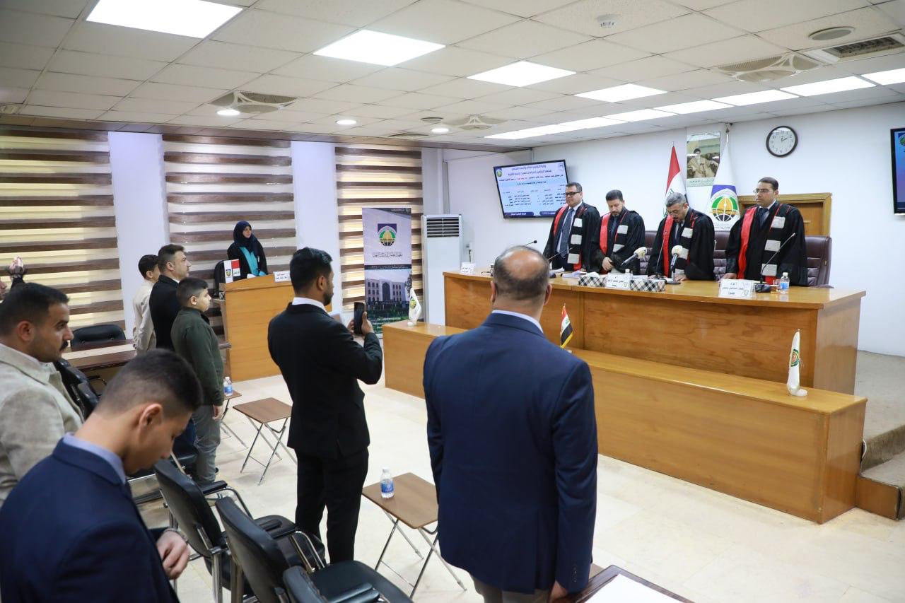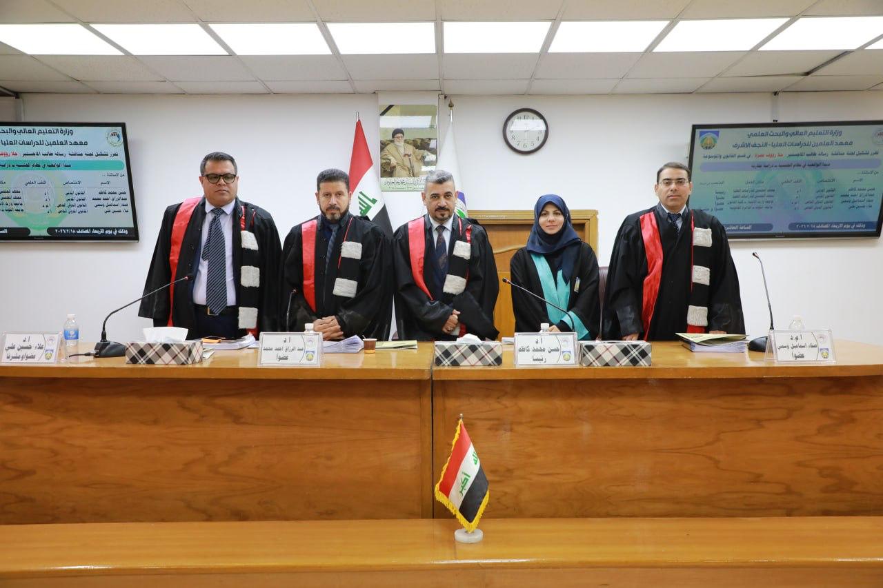 جرت في قسم القانون الخاص بمعهد العلمين للدراسات العليا، الاربعاء ١٨ شباط 2026، مناقشة رسالة الماجستير الموسومة "مبدأ الواقعية في نظام الجنسية - دراسة مقارنة" للطالبة "حلا رؤوف حمزة" و ترأس لجنة المناقشة ا.د حسن محمد كاظم من معهد العلمين، وضمت لجنة المناقشة ا.د عبد الرزاق احمد محمد من معهد العلمين، وا.م.د صفاء اسماعيل وسمي من كلية القانون جامعة وارث الانبياء، وا.د علاء حسين علي من الدائرة القانونية جامعة الكوفة عضواً ومشرفاً، وبعد مناقشة مستفيضة تم إجازة الرسالة.
