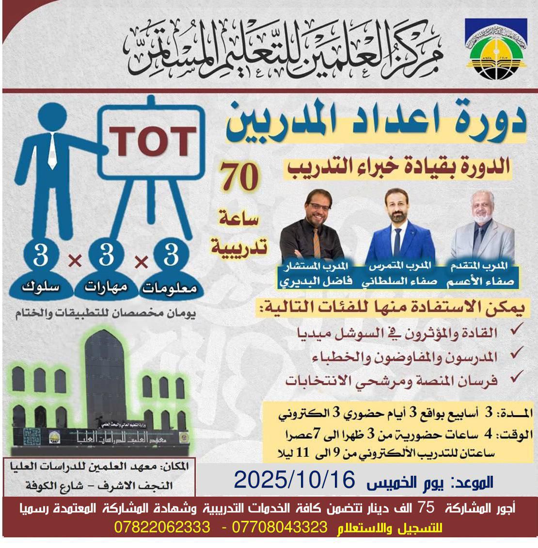 يعلن مركز العلمين للتعليم المستمر في معهد العلمين للدراسات العليا في محافظة النجف الاشرف عن دورة: