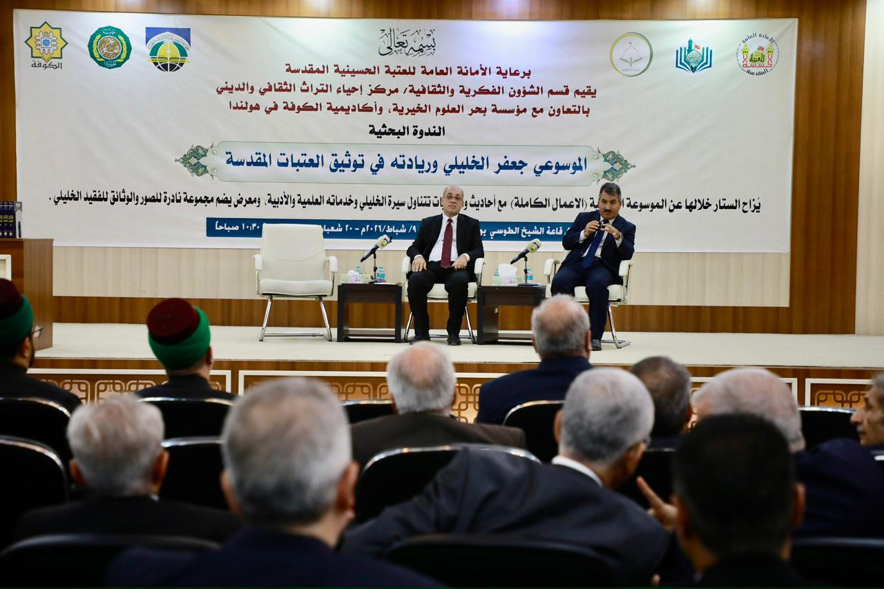 نظم مركز إحياء التراث الثقافي والديني التابع لقسم الشؤون الفكرية والثقافية في العتبة الحسينية المقدسة بالتعاون مع مؤسسة بحر العلوم الخيرية ومعهد العلمين للدراسات العليا، واكاديمية الكوفة في هولندا، الاثنين 9 شباط 2026، ندوة بحثية تحت عنوان " الموسوعي جعفر الخليلي وريادته في توثيق العتبات المقدسة"، على قاعة الشيخ الطوسي بمعهد العلمين، بحضور نائب الأمين العام للعتبة الحسينية المقدسة السيد محمد علي بحر العلوم، ومعالي الدكتور إبراهيم بحر العلوم رئيس مؤسسة بحر العلوم الخيرية، والمهندس يوسف كناوي محافظ النجف، وعدد كبير من السادة العلماء وفضلاء الحوزة العلمية، والاكاديميين والباحثين وطلبة الدراسات العليا في معهد العلمين والمواطنين.