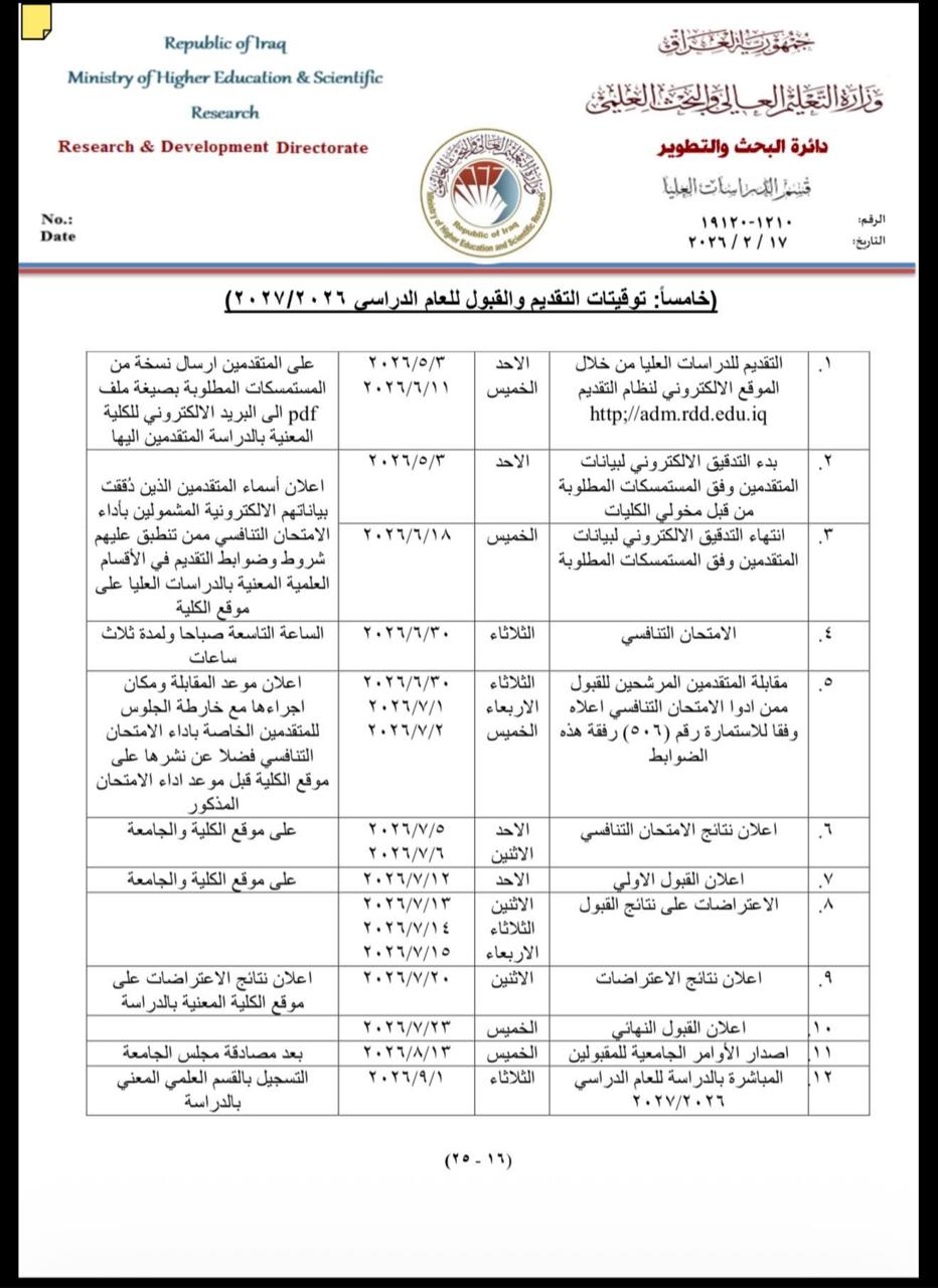 اعلن عميد معهد العلمين للدراسات الأستاذ الدكتور زيد عدنان العكيلي، الثلاثاء 17 شباط 2026، ان المعهد اكمل كافة الاستعدادات لاستقبال الراغبين بالتقديم للدراسات العليا في المعهد للعام الدراسي 2026-2027، للماجستير والدكتوراه في القانون العام والخاص والعلوم السياسية، والماجستير في الاعلام والمحاسبة والقانون الجنائي والعقود العامة والفكر السياسي/الدراسات السياسية، والدبلوم العالي في الانتخابات والحكم الرشيد، موضحا ان وزارة التعليم العالي والبحث العلمي الموقرة أصدرت توقيتات التقديم للدراسات العليا في معهد العلمين وبقية الجامعات العراقية للعام الدراسي 2026 – 2027، حيث يبدأ التقديم يوم الاحد 3 / 5 / 2026، وينتهي يوم الخميس 11 / 6 / 2026، وسيكون الامتحان التنافسي يوم الثلاثاء 30 / 6 / 2026، على ان تبدأ مقابلات المشتركين في الامتحان التنافسي في نفس اليوم وعلى مدى 3 أيام، موضحا ان مواد الامتحان التنافسي ولكافة الأقسام منشورة على صفحة المعهد على مواقع التواصل الاجتماعي، مشيرا الى ان المباشرة في العام الدراسي 2026 – 2027 ستكون يوم الثلاثاء 1 /9 /2026، وقال السيد العميد ان المعهد شكل لجنة استقبال خاصة لمساعدة الراغبين باكمال دراساتهم العليا في معهدنا طوال فترة التقديم ومن الساعة 9 صباحا وحتى الساعة 6 مساء.